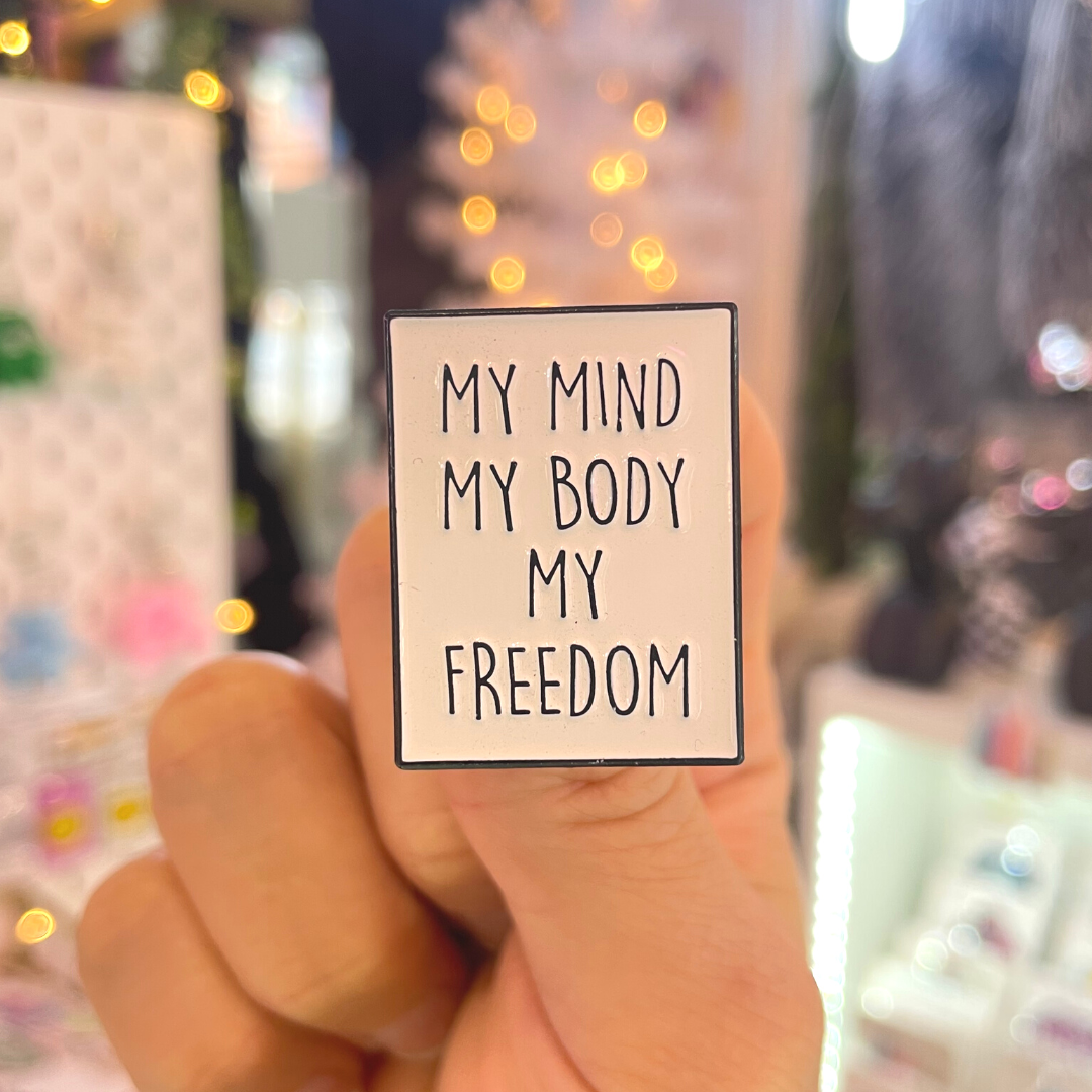 Show off your unique style with this cool pin: My Mind, My Body, My Freedom! With two vibrant colors - black and white - it looks great on jackets and backpacks. Let your individuality shine - it's sure to be a conversation starter!