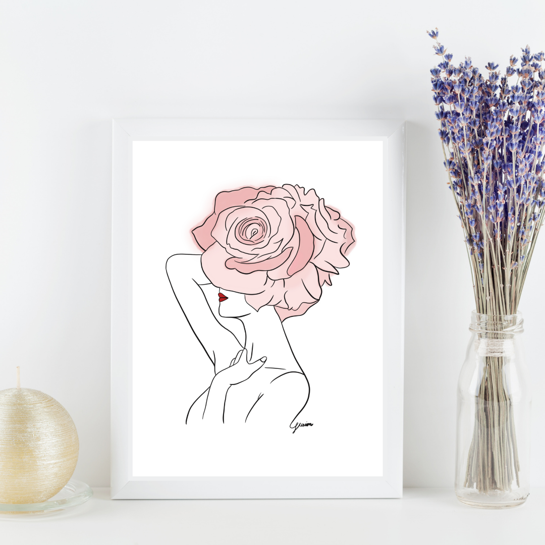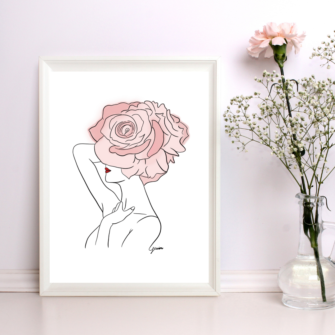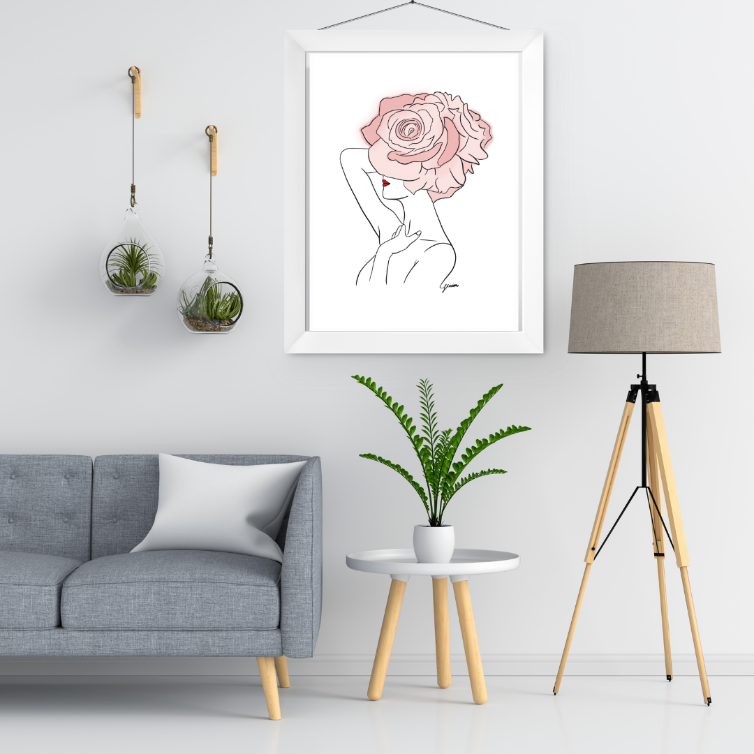 Pink Flowers and Red Lips Art Print | Home Decor | Minimalist Drawing | Room Ideas