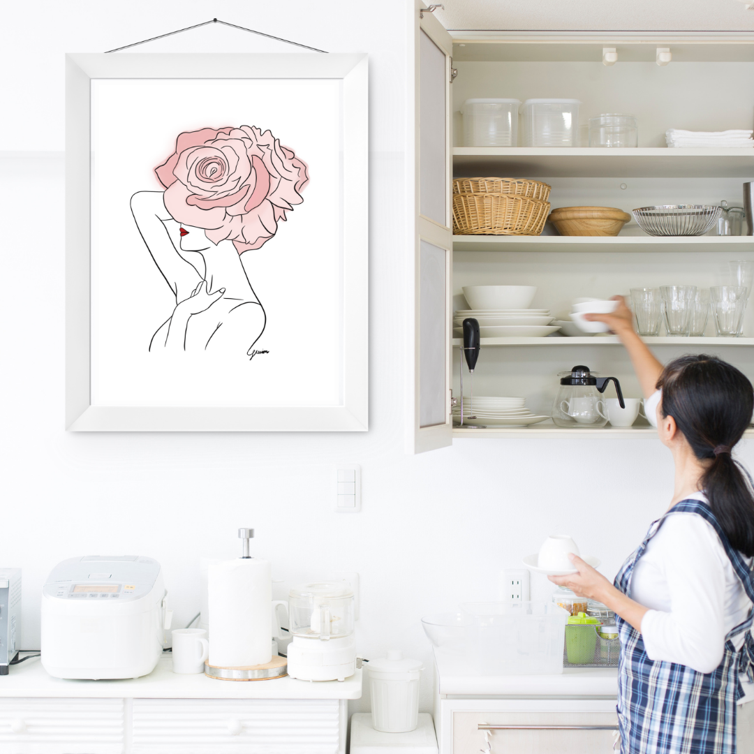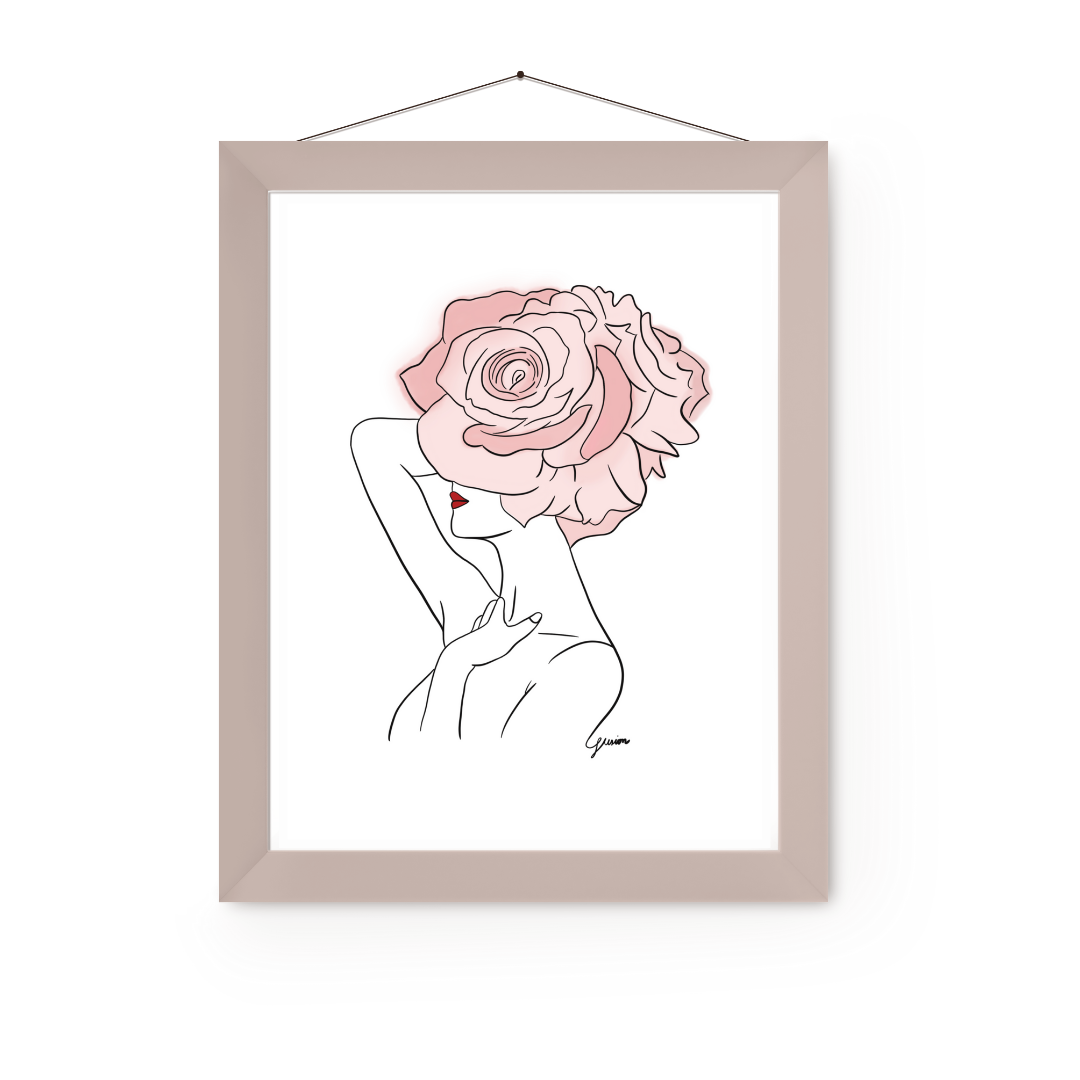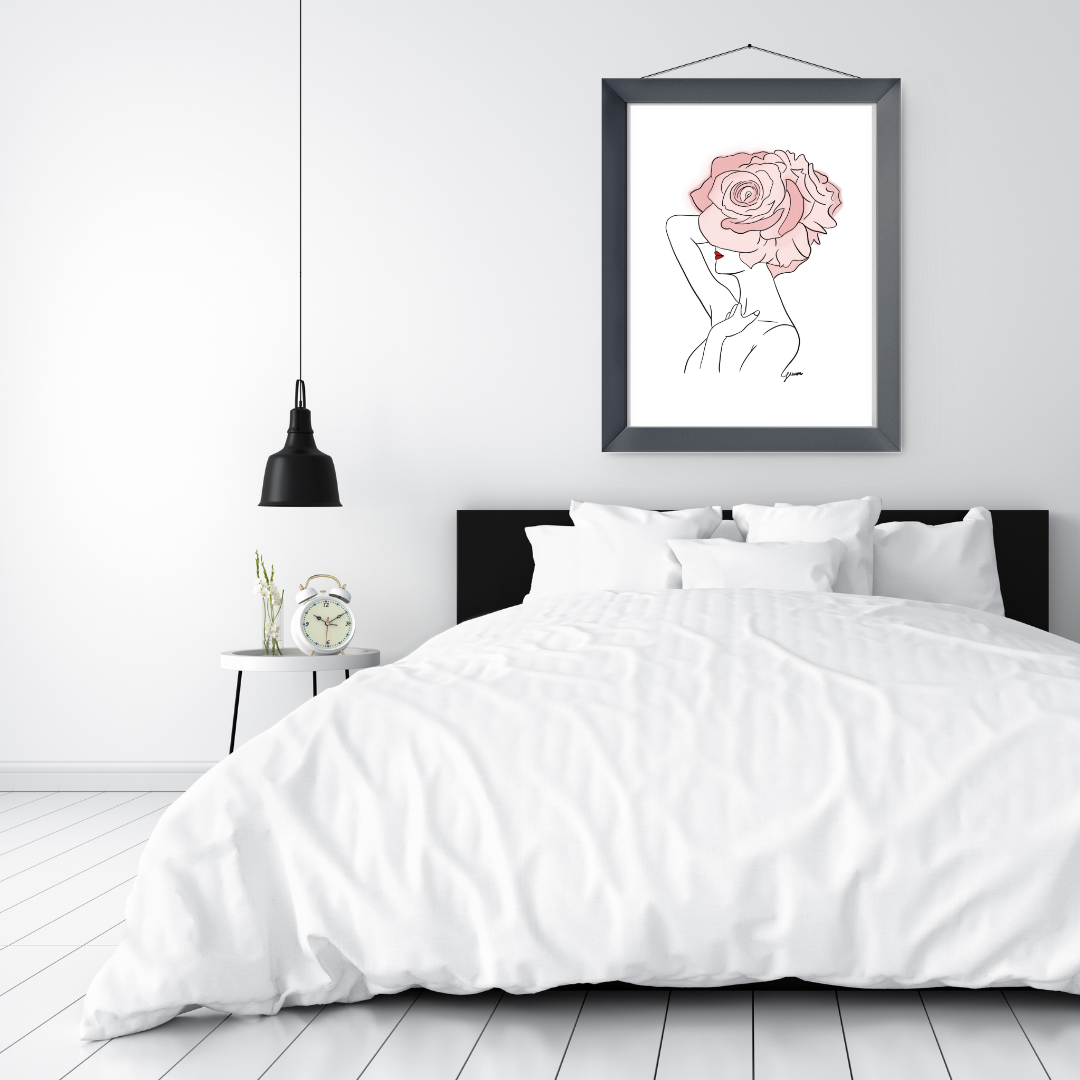 Pink Flowers and Red Lips Art Print | Home Decor | Minimalist Drawing | Room Ideas
