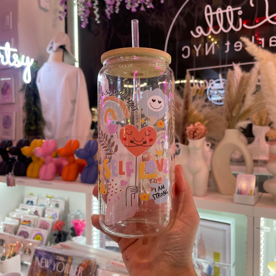 Spread positive vibes with our Self Love Cups! Made in New York, these glass cups are perfect for icy beverages. Infused with good energy, they'll boost your mood and remind you of your worth. Self-love never tasted so good.