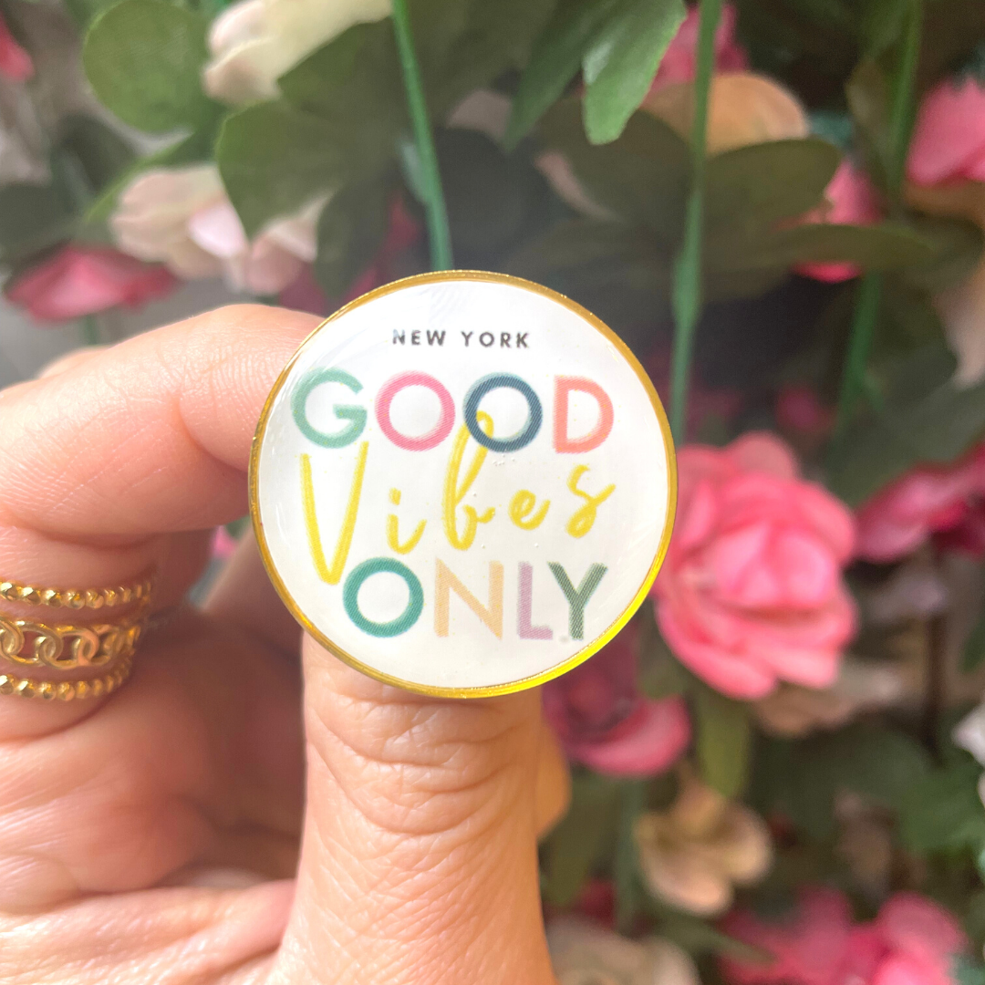 Spread some good vibes with this eye-poppingly colorful Good Vibes Only pin – perfect for livening up your backpack, denim jacket or accessories! Get ready to turn heads with a statement piece that'll let everyone know positive vibes only!